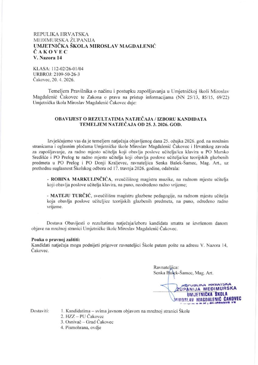 Obavijest o rezultatima natječaja od 25.3.2026.