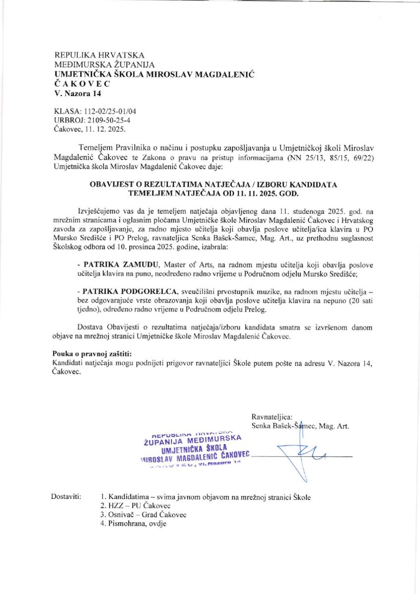 Obavijest o rezultatima natječaja od 11.11.2025.