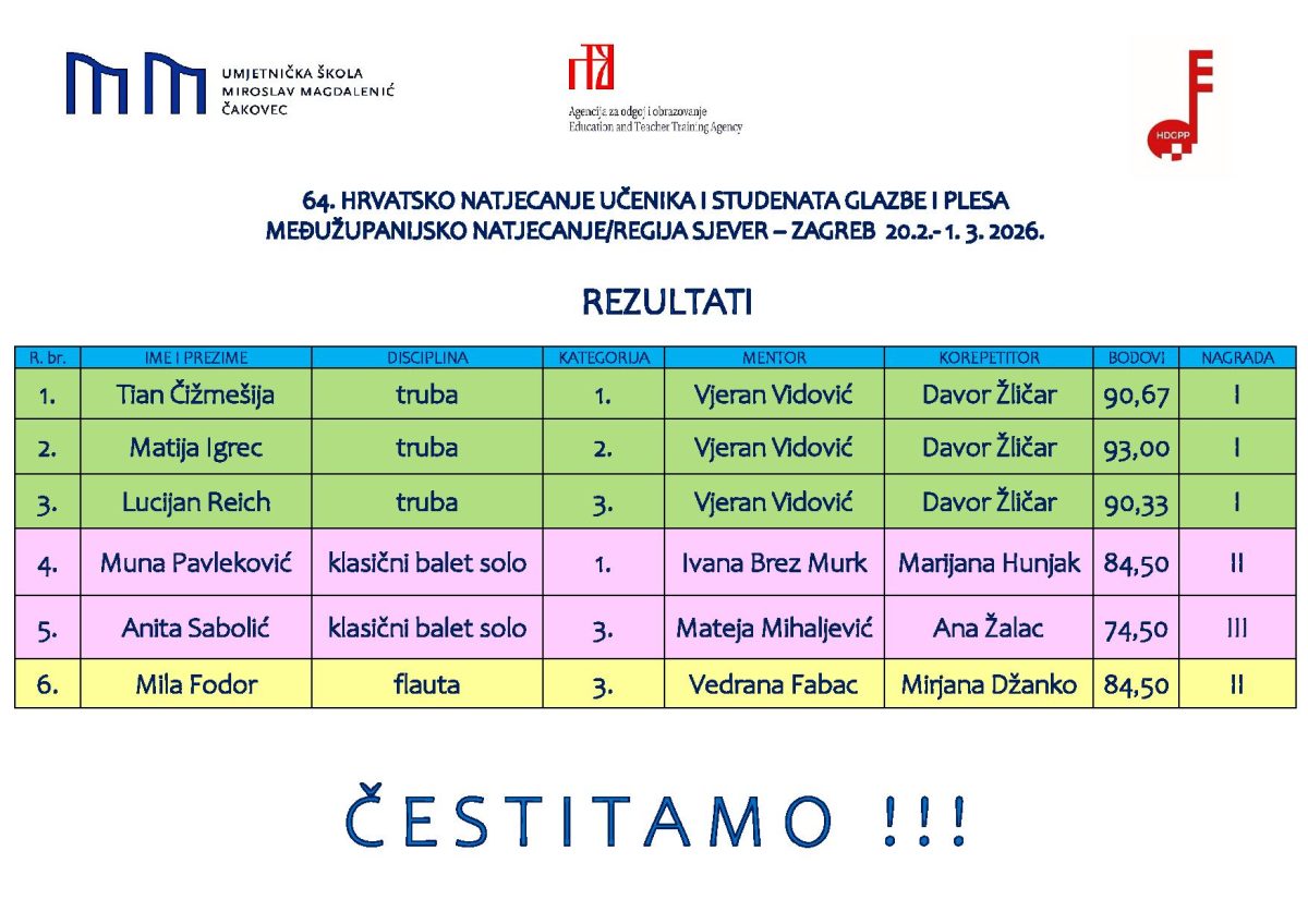 Rezultati – 64. HRVATSKO NATJECANJE UČENIKA I STUDENATA GLAZBE I PLESA (Međužupanijsko natjecanje)